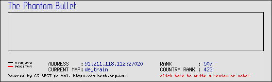 Cервер The Phantom Bullet Public , расположенным в городе Киев, Украина, где на момент последней проверки играют 1 игроков и 0 ботов. Максимальное количество слотов на сервере 10.