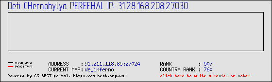 Пользовательское описание отсутствует. Если Вы являетесь владельцем данного сервера, Вы можете получить доступ к статистике и редактированию этого описания. Для этого перейдите по ссылке "Это мой сервер", расположенной в предыдущей таблице. Если ссылки нет - значит Вы все еще не зарегистрировались на нашем портале или забыли зайти под своим логином.