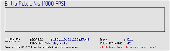 Пользовательское описание отсутствует. Если Вы являетесь владельцем данного сервера, Вы можете получить доступ к статистике и редактированию этого описания. Для этого перейдите по ссылке "Это мой сервер", расположенной в предыдущей таблице. Если ссылки нет - значит Вы все еще не зарегистрировались на нашем портале или забыли зайти под своим логином.