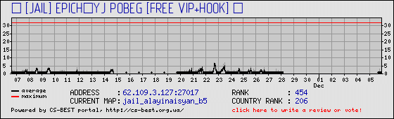 Cервер 亗 [JAIL] ЭПИЧНЫЙ ПОБЕГ [FREE VIP+HOOK] 亗 Jail , расположенным в городе Москва, Российская Федерация, где на момент последней проверки играют 1 игроков и 0 ботов. Максимальное количество слотов на сервере 32.